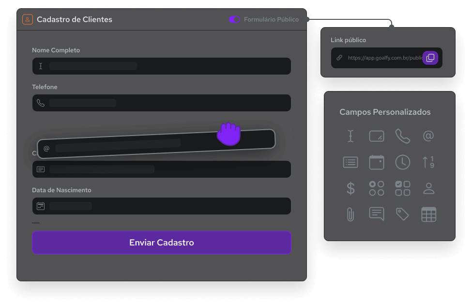 A Goalfy oferece conexões via API, Webhook ou Zapier com mais de 3 mil aplicações diferentes.